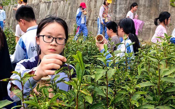 午后,学生们进茶园。大家观察了茶叶的生长环境、形态特征,了解茶叶的采摘标准和制作工艺。同学们看着自己辛勤劳动的成果——装满亲手采摘鲜嫩叶片的茶篓时,深切感受到劳动带来的快乐和成就感。而当同学们了解到1斤茶叶需要4—5斤嫩叶才能炒制出来时,对比自己的采摘数量,他们深刻认识到每一片茶叶都凝聚着茶农的辛勤汗水,每一片茶叶都来自不易,从而对农业生产有更深刻的认识和尊重。