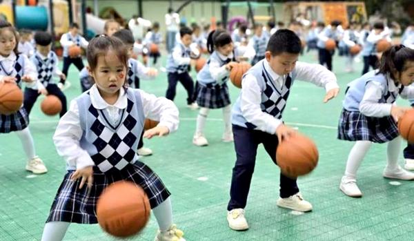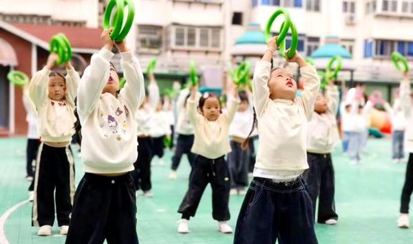 大班幼儿率先登场。他们的早操编排巧妙融合了器械操、篮球基本动作以及跳绳等多种元素。整套操富有趣味性和挑战性,充分体现了大班幼儿动作发展的成熟与自信飞扬的个性。 中班的小朋友们同样表现出色。他们的早操表演活泼欢快,动作设计贴合中班幼儿的年龄特点。孩子们跟着音乐的节拍,时而蹦跳,时而伸展,一张张红扑扑的小脸上洋溢着快乐的笑容。