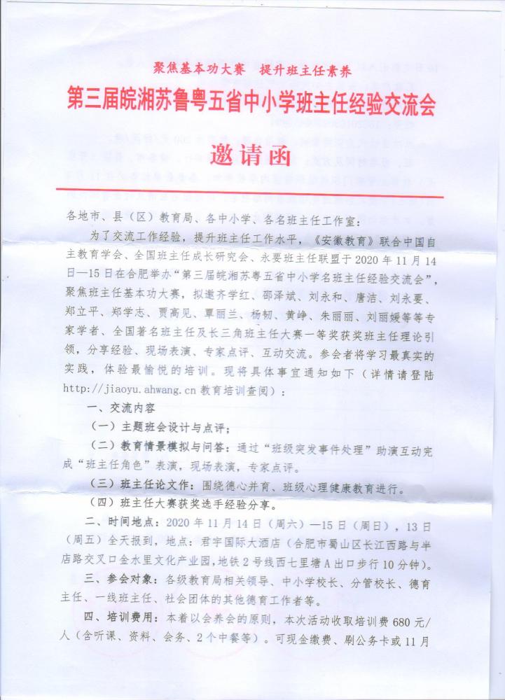 第三届皖湘苏鲁粤五省中小学班主任经验交流会邀请函