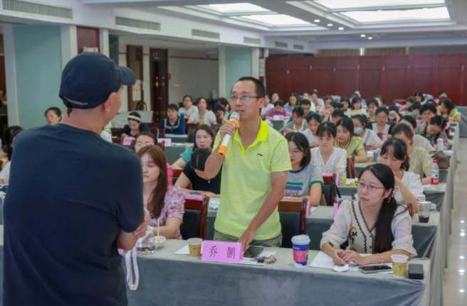 图为蔡校长与老师互动交流 如何让学生在“成事”中“成人”,蔡海峰校长继续为老师们带来《新课标下的语文课堂》讲座。以2022版语文课程标准为导入,提出新的课程标准要求语文教学要促进学生核心素养。以“语文学习任务群”为关键词,提出语文学习任务群是语文课程内容的组织与呈现,明确了“为何学”,规定了“学什么”,指明了“怎么学 ”,设定了“学得如何”。结合自己的实践经历提出了语文学习任务设计的方向,让学生在“做事”中“学语文”在“成事”中“成人”,既分享了操作的方法,又分享了背后的思考。