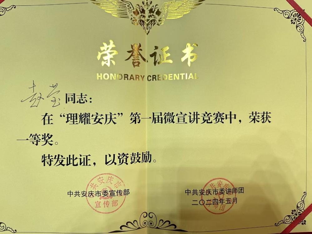 5月27日下午,由中共安庆市委宣传部主办、中共安庆市委讲师团承办的学习贯彻习近平新时代中国特色社会主义思想——“理耀安庆”第一届微宣讲竞赛总决赛在碧桂园凤凰酒店举行。安庆市高琦幼儿园教师赵莹经区级初赛和市级复赛的层层选拔,代表大观区入围总决赛。经过激烈的角逐,赵莹老师从17名参赛选手中脱颖而出,荣获一等奖。